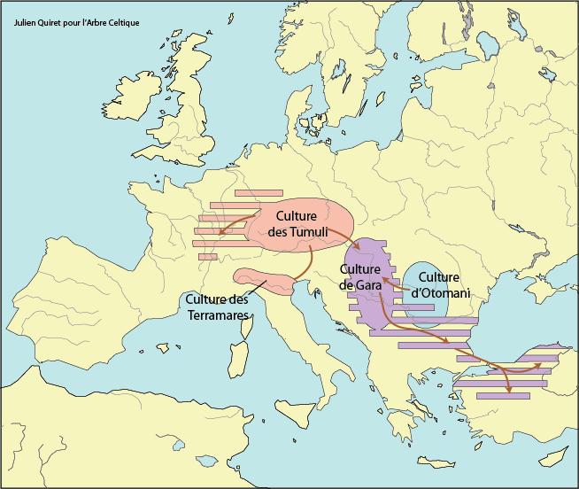 Re: L'origine des langues celtiquesPS. 1. - J'ai oublié d'indiquer le nom de ce prolongement des Champs d'Urnes en Italie, c'est la culture de Villanova ou villanovienne, c'est à dire les peuples italiques. C'est la période supposée de l'individualisation (géographique) entre peuples italiques et celtique. Si l'on en croit B. Sergent, ces deux groupes étaient déjà distincts linguistiquement.