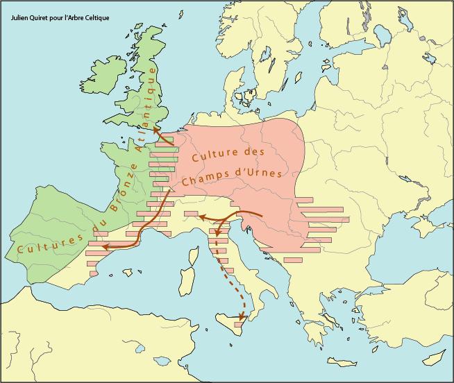 L'on peut noter aussi mais bien plus tôt une diffusion semblable des gobelets campaniformes qui serait d'origine ibère d'après les archéologues (J.P. Demoule) bien que le Danemark le revendique aussi. Cette culture des gobelets est présente dans les derniers âges des constructions mégalithiques atlantiques. C'est effectivement intéressant de retrouver cette relation à l'Espagne et à la Grèce dans les textes mythiques irlandais. Dans la plupart de mes lectures (d'information archéologique récente) les "champs d'urnes" se diffusent par acculturation (pas de traces probantes de conflit entre populations) ce qui nous amène à penser que cette révolution fondamentale des modes d'inhumation (les plus stables cultuellement) était portée par d'autres innovations bien plus intéressantes au niveau matériel et de la vie de tous les jours. Muskull / Thomas Colin