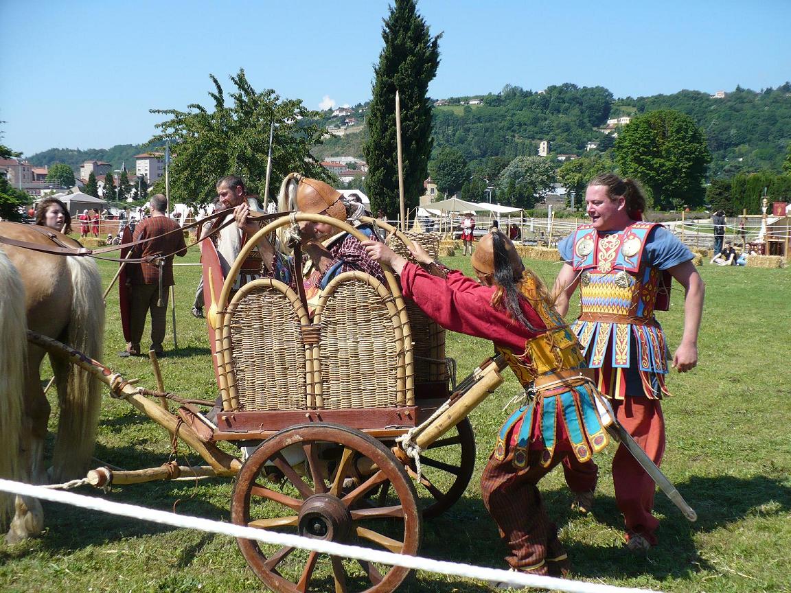 Que dire... Comment remercier Nathalie et Patrice des Portes... Je peux garantir que tenir debout sur le char lancé au galop pour balancer des javelines... et bien c'est une expérience unique, grisante ! On peut remercier de tout cœur Melinos et New Mexico alias "Nouillette" et "Rodoudou", nos deux amis à quatre pattes pour leur travail formidable, leur calme et leur patience ! Il a fait très chaud et ils ont transpiré autant que nous ! Bravo les chevaux ! Enfin, l'équipe de fantassins Leuki fut remarquable au vu du peu d'entraînement effectués avant St Romain ! Si tout va bien, l'année prochaine, on devrait avoir 2 chars... Arrêtes ton char et viens boire une bière... Ok j'arrive ! ![]() VAE VICTIS