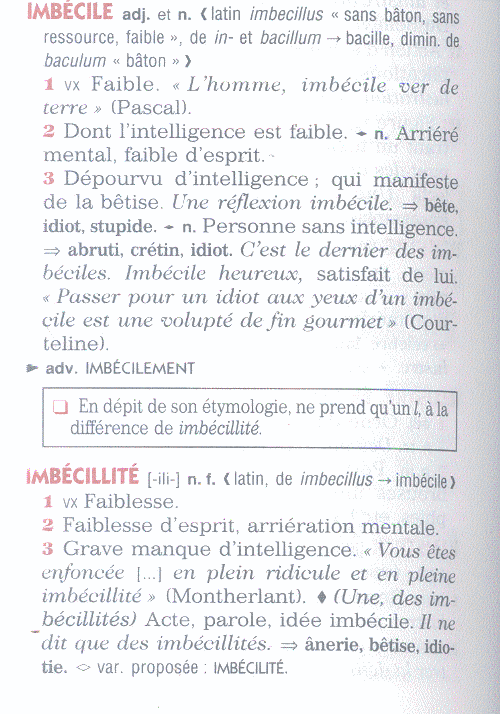 Les rectifications proposées en 1990 n'ont rien fait d'autre, dans ce domaine, que de recommander à nouveau ces alignements. Imbécilité a donc fait son entrée dans les dictionnaires. La nouvelle édition en cours du Dictionnaire de l'Académie le cite même en entrée en considérant imbécillité comme une " graphie ancienne ". Le Petit Robert le signalait depuis trois éditions (2000, 2001 et 2002) en précisant : " on écrirait mieux : imbécilité ".