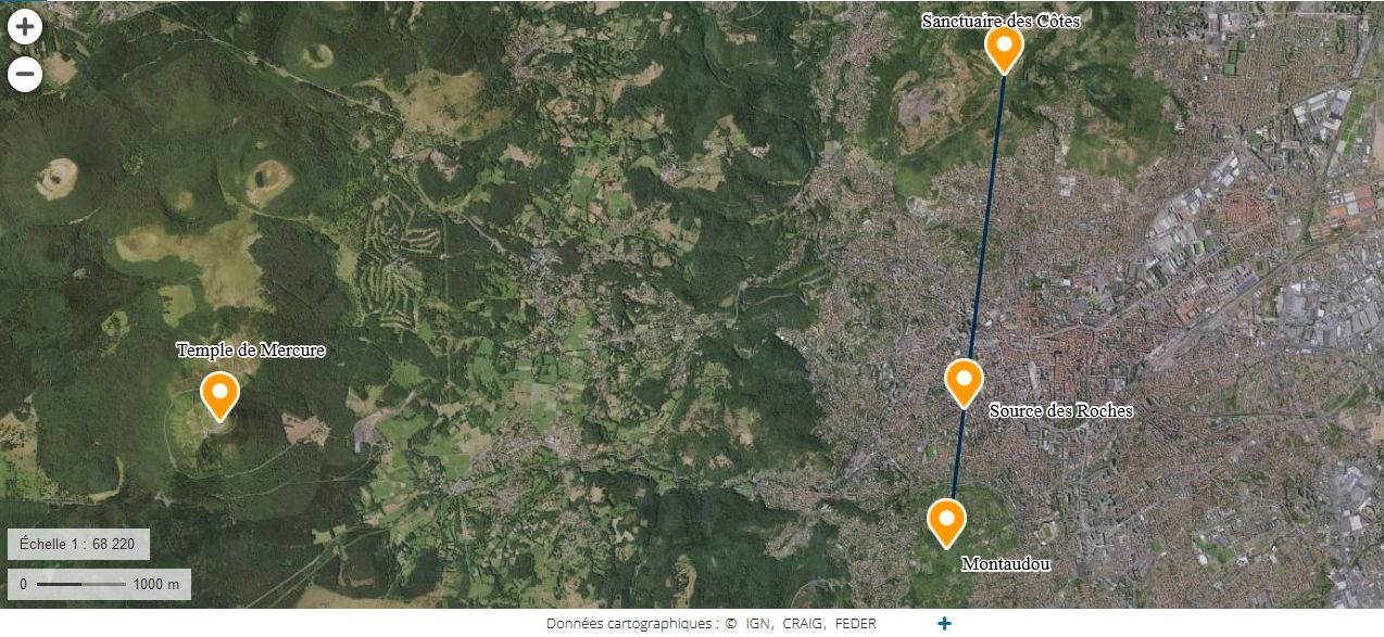 Pour les Côtes, je ne peux rien affirmer, n'ayant connaissance précise de la localisation du site, d'où mon point d'interrogation. Cependant, à partir de la source des Roches - qui serait gallo-romaine (?), précisément localisée, en descendant dans le 181° (une direction 180° ne modifierait pas sensiblement les choses), on passe par le théâtre de Montaudou (le fanum est au sud ouest du théâtre, le jouxtant presque), gallo-romain lui aussi jusqu'à plus ample information, le flanc ouest à 742m d'alt. (point culminant de la ligne) du Puy Giroux (mi-distance assez précisément, et point culminant de ce puy étant presque perpendiculaire dans le 90° à la "méridienne"), la limite Chanonat - St-Amant-Tallende (au nord de la chapelle Ste-Anne et de Chadrat), 2e point culminant, 731m, et quasiment perpendiculaire à cet endroit, environ 93°, et enfin le site de Liozon / Liauzun (Lugdunum?), mais ce site semble avoir été peu étudié et pas gallo-romain ??? Je mesure 15,24 km. Matthieu Poux et ses 2 collègues ont publié sur Academia-edu. "De Mercure Arverne à Mercure Dumias".