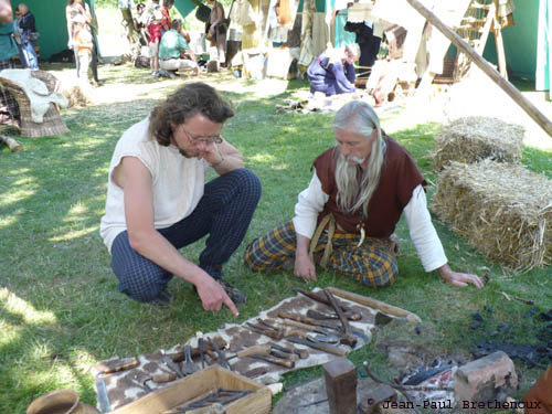 Voir ces groupes et bien plus, rencontrer et discuter avec Sedullos, Eporenos et leurs amis m'a fait prendre conscience de la consistance réelle de ce travail et de toute l'importance de cette manière si vivante d'aborder l'histoire ancienne. La reconstitution, ce n'est pas uniquement de beaux costumes, de beaux combats et une mise en scène pour faire plaisir et se faire plaisir....On se rend compte tout de suite, avec le seul effet visuel, qu'on fait un vrai bond dans le temps et puis il suffit de discuter un peu, de poser une question pour se rendre compte de la passion et du très haut niveau de connaissance qui existe chez ceux qui veulent vivre l'histoire. C'est en tout cas le cas des Gaulois d'Esse ou encore de cet artisan Ambien ou de cet ingénieur Romain complétement intarissables pour commenter la moindre pièce mobilière ou le moindre outil. En fait ne posez jamais la plus infime question, sur ce que vous pensez être un détail, si vous êtes pressé, car vous resterez à voir et à écouter surpris, une explication complète de telle pièce de costume, d'outillage ou d'artisanat avec l'évocation de la source archéologique précise, du contexte historique, économique, biologique, voir climatique, permettant de soutenir l'hypothèse aujourd'hui. A travers la recherche - in concreto - des gestes anciens, il s'agit de permettre la découverte, l'explication des données brutes que nous livre, parfois très aridement, l'archéologie. C'est ainsi qu'Eporenos a pu me donner l'explication, l'utilité, de plusieurs pièces, comme un étau ou une grille de porte, dont l'interprétation avait échappé aux archéologues, le tout révélant au passage l'extrême ingéniosité des anciens. C'est ainsi qu'on se rend compte que la reconstitution, qui a bien sûr une dimension spectaculaire, est aussi, et avant tout, une vraie démarche historienne et une part toute nouvelle mais fondamentale.......de l'archéologie; l'archéologie expérimentale ou la recherche de la signification des données en expérimentant concrètement en tentant de recréer le contexte. Combien de fois peut on lire, des rapports, des ouvrages d'archéologues totalement frustrants parce qu'ils entrouvrent une porte sur le passé mais la referment aussitôt, renonçant presque toujours à l'exercice si risqué de l'interprétation. C'est aussi parce que l'archéologie ne se donne pas vraiment les moyens de l'interprétation alors que s'agissant de périodes très anciennes, les sources textuelles sont rares. Je crois que la reconstitution menée avec sérieux, conscience, respect des connaissances, comme chez les Gaulois d'Esse, peut aider à ouvir un peu plus la porte ou la maintenir ouverte un peu plus longtemps. Où et quand ?