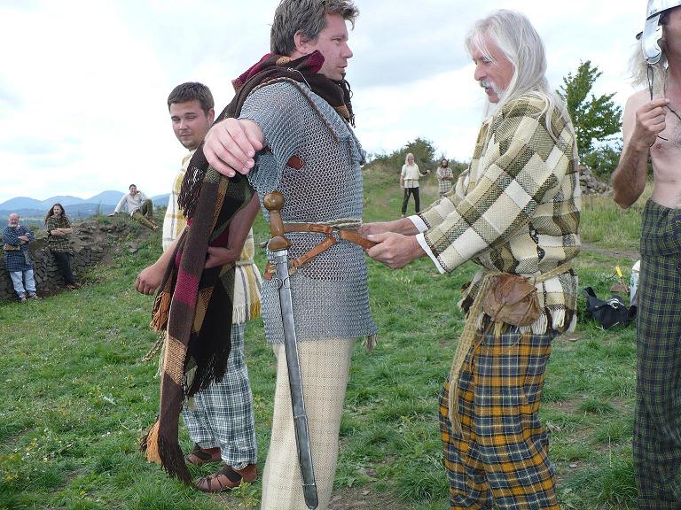 Re: L'équipement et l'art de la guerre chez les GauloisPatrick Boos attache à la taille du comédien jouant Vercingétorix lors d'un tournage documentaire.