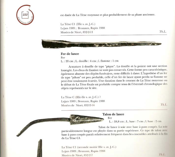 Re: L'équipement et l'art de la guerre chez les GauloisJuste une image du fer de lance et d'un des 2 talons du sanctuaire de Faye-L'Abbesse, avec les notices de Thiery Lejars, p. 222