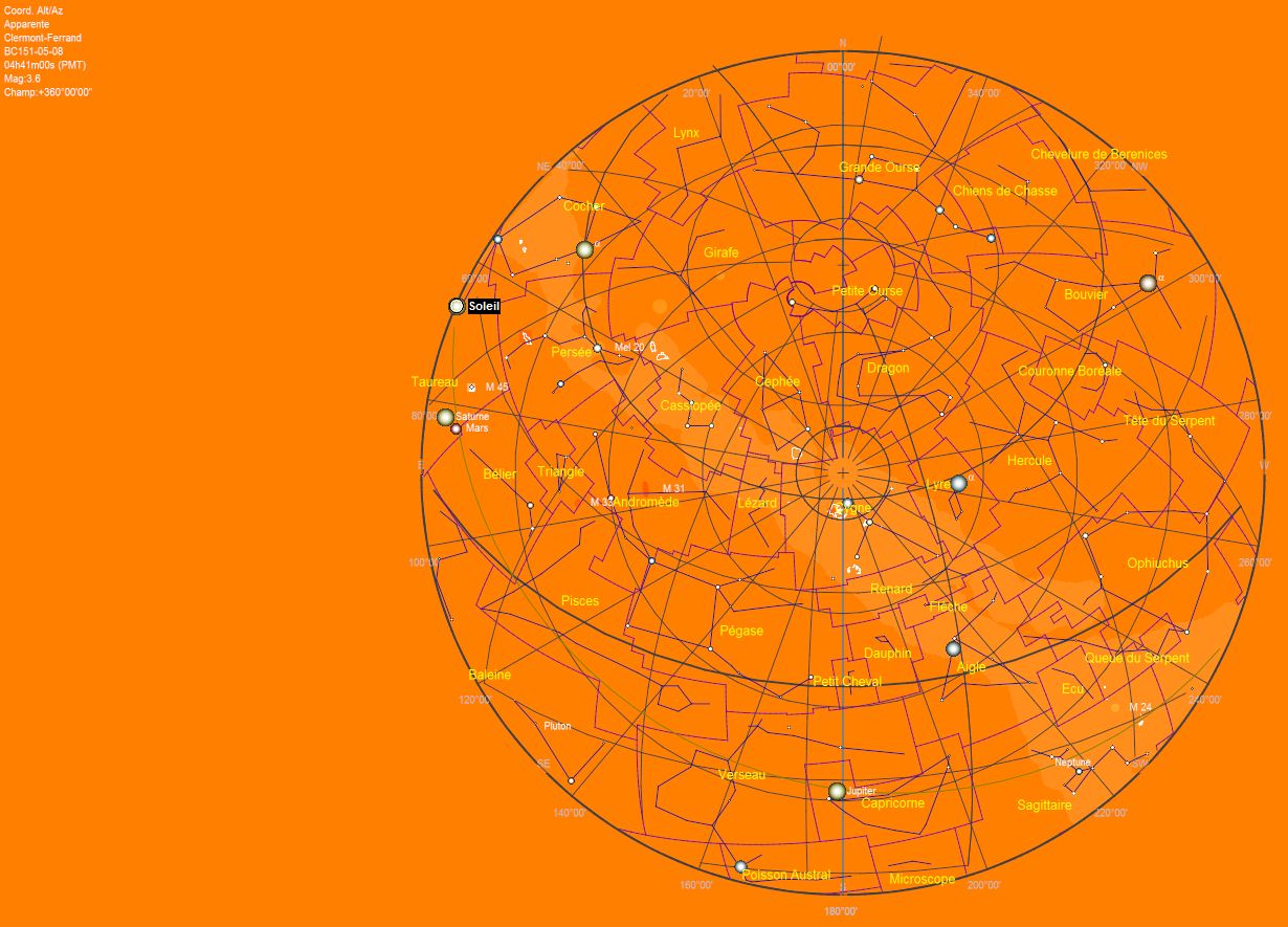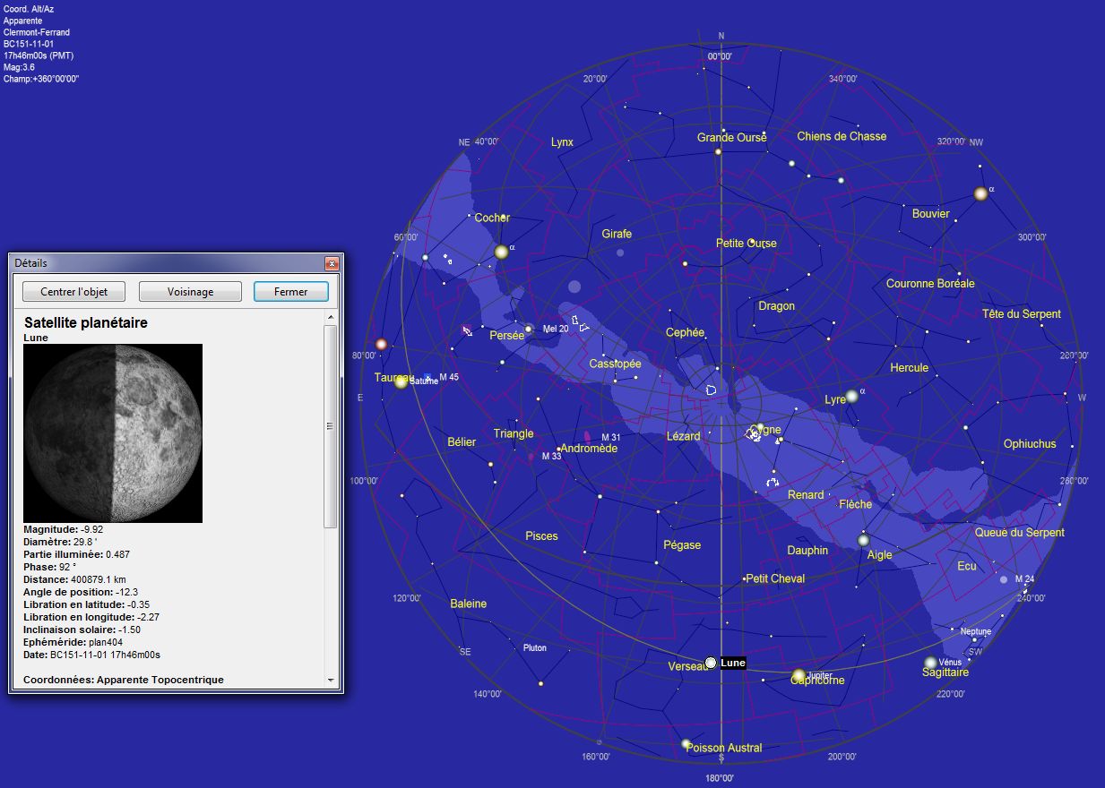 Re: Le sanctuaire Arverne de Corent et l’Astronomie ?Voici une autre simulation du ciel grâce au logiciel "Carte du Ciel / SkyChart", pour l’occurrence du 30/10/-150 . L'auteur du logiciel (Patrick Chevalley) a gentiment amélioré la précision des calculs pour l'antiquité suite à plusieurs échanges avec moi cette dernière semaine (modèle de précession valable sur 200.000 ans selon une méthode publiée en août dernier par le SYRTE-Observatoire de Paris, meilleure approximation de la quantité DeltaT=TT-UT1 irrégularités de rotation de la Terre).