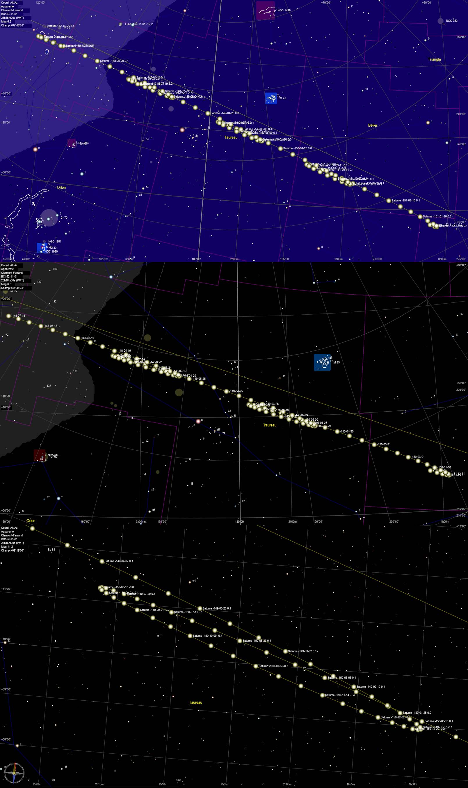 Volume 534, et un bon calcul du DeltaT), pour se rendre compte du mouvement de Saturne dont la période orbitale/sidérale est de presque 30 ans (10 757,7365 jours soit 29,45 ans) et de sa période synodique de 378,09 jours. Sur le haut et sur fond bleu, du 01/01/-152 au 07/-148, on se rend bien compte de ses boucles rétrogrades sur le fond des étoiles lointaines, tous les 378 jours (lorsqu'elle est à l'opposé du Soleil depuis la Terre, à l'opposition. Forme une ligne Soleil-Terre-Saturne). On remarque l'entrée de Saturne dans le Taureau vers le 25/04/-150 JULIEN, puis la boucle de rétrogradation. Le centre de la boucle est aussi le moment où Saturne est au plus proche de la Terre et donc où sa magnitude, son éclat dans le ciel est le plus fort. La magnitude de Saturne reste toujours forte, elle varie de la valeur 1.4 pour la valeur la plus faible, à -0.5 pour son plus fort éclat, lorsque elle est au plus proche de la Terre et en période où ses anneaux sont pleinement ouverts (elle reste moins lumineuse que l'étoile la plus lumineuse du ciel : Sirius). On remarque aussi que la dimension du Taureau couvre 2 à 3 boucles/rétrogradations de Saturne. En dessous, une version plus zoomée sur fond noir. La première boucle de rétrogradation était presque entre Aldébaran et les Pléiades. Donc environ tous les 30 ans, une première boucle de rétrogradation se produira lorsqu'elle entre dans le Taureau, avec son éclat le plus fort au centre de cette boucle, à l'opposition (vers le 27/10/-150 dans cet exemple). La position de cette première boucle se déplace de période orbitale en période orbitale, de 30 ans en 30 ans. Pour l'an -122, la boucle est juste après la frontière du Bélier, idem pour l'an +2000. David. Dernière édition par dromeuf le Lun 03 Oct, 2011 20:29, édité 1 fois.
