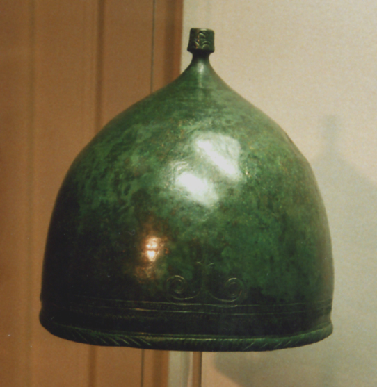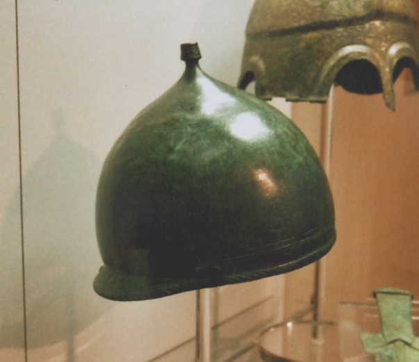 Patrice, Bricta, il y a me semble-t-il un souci de typologie. Je me fonde sur Casques antiques de Michel Feugère chez Errance. Le casque en bronze dont Bricta a mis la photo est un casque italo-étrusque (figure 5, p. 64 ) différents des 4 casques celtiques de Montefortino. Le casque photographié par Patrice pourrait-être un type Buggenum, c'est à dire un type de casque de l'armée césarienne, Feugère, p. 47-50. Les deux types de casques italo-étrusque et Buggenum sont d'après Michel Feugère souvent confondus. Le casque de type Buggenum continue a être en usage jusqu'au tournant de notre ère, jusqu'à l'expédition de Varus qui s'achève par le désastre de la Toteuburgerwald en 9 apr. J.-C. , l'évacuation des camps permanents comme celui de Haltern et le repli du limes sur le Rhin. A noter qu'un casque de type Buggenum a été retrouvé en Ossetie du Nord : Kurgan 1 de Sereginski, Cerysev. Jean-Paul Brethenoux. Sedullos Lemouico immi exobnos in catue ! ΣΕΔΟΥΛΛΟΣ (Graecum est, non legitur !)