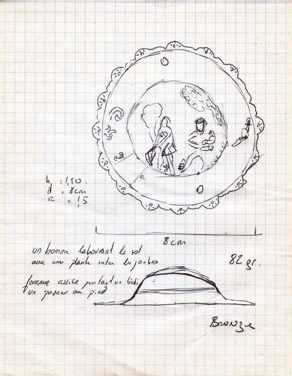 il est doté de seulement deux trous de fixation et représente une scène champêtre avec a gauche un homme (en érection) maniant une faux? Et une sorte de tuberculeuse entre les jambes et a droite une femme assise avec un bébé dans les bras. La frise extérieure est ornée de petites gravure avec notamment a droite un casques croisant un sabre courbé.