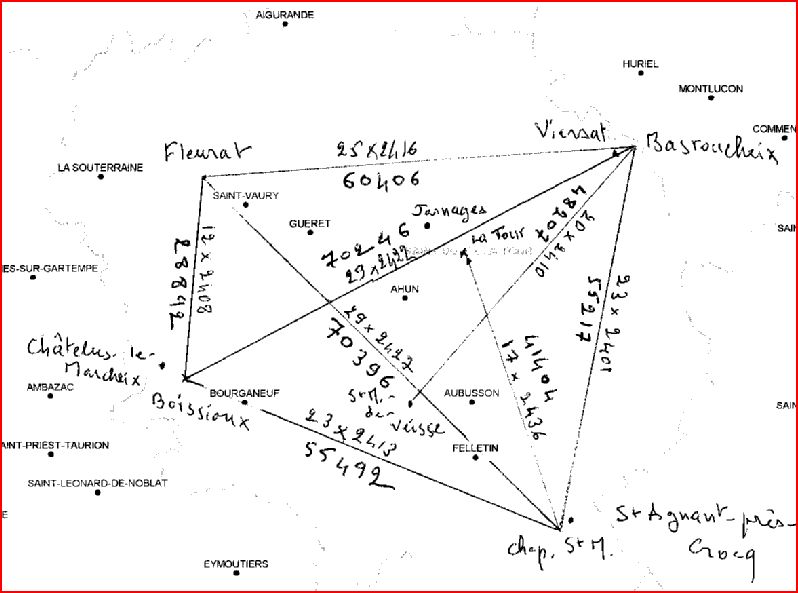 Le point culminant (439 m d’alt., N 46°26,09’ E 1°49,66’) du bourg d’Aigurande (36, dpt de l'Indre) (à ~500 m de la limite avec le département de la Creuse) est situé, à très peu de chose près, sur la bissectrice de l’angle sud-est de sommet Saint-Michel en Saint-Agnant-près-C. (39,61° pour le secteur sud-ouest, 39,45° pour le secteur sud-est, rappel de la valeur de l'angle sud-est du quadrilatère 79,06°). Il est aussi à 51 986 m de Boissioux et à 51 707 m de Basroucheix. L’église du bourg d'Aigurande, excentrée à l’est, n’est pas sur le point culminant du bourg. Aigurande est à l'extrémité occidentale de la ligne de hauteurs qui forme le tiers est de la limite sud du département de l’Indre. Ces hauteurs dominent la vallée de la Petite Creuse. Le point culminant de ce département, 456 m d’alt., est d’ailleurs à ~12,5 km à l’est d’Aigurande, au Terrier Randoin dit aussi Signal de Fragne. On a un triangle quasi-isocèle Boissioux 51 986 m Sommet d'Aigurande 51 707 m Basroucheix 70 246 m (base, et ligne diagonale) Boissioux. Valeur des secteurs: a) de sommet Boissioux 47,42°, b) de sommet Basroucheix 47,58°, c) de sommet sommet d'Aigurande 85°. La ligne "sommet du bourg d’Aigurande / chapelle Saint-Michel en Saint-Agnant-près-Crocq" coupe très exactement perpendiculairement la ligne diagonale "Boissioux – Basroucheix" au point: N 46°7,913’ E 2°3,812’, 470 m alt. en Cressat, à ~400 m de la limite communale du nord de Moutier-d’Ahun, à 38 227 m d’Aigurande, à 35 275 m de Boissioux, à 34 971 m de Basroucheix et à 42 694 m de Saint-Michel en Saint-Agnant-près-Crocq, déterminant ainsi quatre triangles rectangles. Ce point "secteurs droits" est à 4422 m du Camp de César (N 46°5,58’ E 2°3,08’), en Ahun (Acitodunum), qu’on peut soupçonner d’être le chef-lieu d'un pagus nord est des Lémoviques, si on admet comme critère une certaine centralité du chef-lieu de pagus. Le grand quadrilatère Aigurande, Basroucheix, Saint-Agnant-près-Crocq, Boissioux, de 52, 55, 55 et 52 km de côté, avec ses quatre triangles rectangles aux sommets droits proches d'Acitodunum / Ahun délimitait-il-il symboliquement un des pagi des Lémoviques, celui du nord est ? Aigurande, Basroucheix et Saint-Agnant-près-Crocq sont sur les limites des Lémoviques avec leurs voisins Bituriges et Arvernes. Autre fait intéressant: Pour une hauteur (théorique) de l’horizon nulle, on a d’Aigurande, 439 m d'alt., vers Basroucheix, 435 m d'alt., azimut 109,30°N, soit 109°18’N, le Lever du bord supérieur du Soleil le 1er novembre 100AC, en calendrier julien, ou le 30 octobre, en calendrier grégorien (109°33' selon logiciel Lacroix). Et de Basroucheix en Viersat (23) on voyait pareillement en 100AC le lever du bord supérieur de Soleil le 1er novembre (calendrier julien) ou le 30 octobre (calendrier grégorien), pour une hauteur de l'horizon hh = 0° (azimut de 109°29' donnés par le logiciel Lacroix) dans la direction du Mercurol en Ebreuil (03, dpt de l'Allier), 472 m d'alt., sur la limite communale entre Sussat et Ebreuil, au carrefour (point de jonction d'une étoile routière de huit chemins), à N 46°8,23' E 3°3,14', ligne longue de 47 982 m, 20 x 2399,1 m, azimut 109°27,6'N, 7500 pieds de 31,99 cm à rapprocher de l'écart de 3,2 m (proche de 10 pieds "grec" attiques – ou doriques "arrondis" – standard de 32,7 cm) entre les trous de poteaux du sanctuaire de Corent chez les proches voisins Arvernes. Autre curiosité: Basroucheix (23, dpt de la Creuse) est à équidistance de Saint-Angel (63, dpt de Puy-de-Dôme), 20 x 2402 m, 48047 m (150000 pieds de 32,03 cm) et du Mercurol, en Ebreuil (03), 20 x 2399 m, 47 982 m (150000 pieds de 31,99 cm) [la ligne Basroucheix (situé à la limite des Lémovices et des Bituriges Cubi) / le Mercurol en Ebreuil (situé à la limite des Arvernes et des Bituriges?) correspond grossièrement et surtout dans sa moitié est, à la limite supposée entre Arvernes et Bituriges] 03 ÉBREUIL. Le Mercurol, village sur limite communale. Aux 472 m d’alt. N 46°8,23’ E 3°3,14’. A 36 622 m 15 x 2441 m LC47,73° de l’église de Saint-Angel (03). A 47 982 m 20 x 2399,1 m LC70,54° de Basroucheix : azimut 109°27,6’ LbS le 30 octobre 100AC (cal. grég.). Site très probablement à la limite des Bituriges Cubi et des Arvernes. 63 SAINT-ANGEL. Eglise Saint-Michel N 45°59,81’ E 2°56,06’ à 48 047 m 20 x 2402,3 m LC48,91° de Basroucheix en Viersat (23). gg