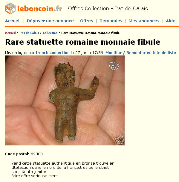 Contrairement à Ebay, le site de vente leboncoin.fr est relativement épargné pour les ventes d'objets archéologiques (notamment grâce à un filtrage manuel je suppose).