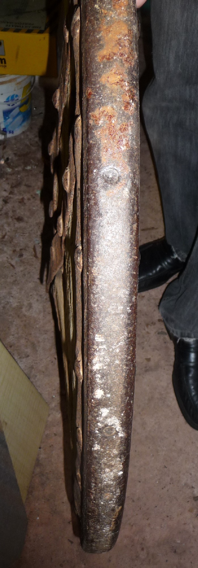 Je n'avais pas pensé à une courroie de transmission mais dans ce cas le chant ne serait-il pas plat ou concave ? Un objet de ce type a une forte force d'inertie, un gros effort pour le lancer et un moindre pour entretenir le mouvement que la mortaise rectangulaire peut transmettre en le démultipliant. De plus, même en milieu sec le fer s’oxyde rapidement et vu l'état de cette "roue" elle n'a que 2 ou 3 siècles au plus en étant très optimiste. Y voir "une roue gauloise" est à mon humble avis un peu fantasmatique... Muskull / Thomas Colin