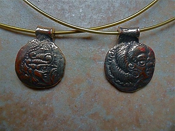 Un numismate local m'a permis de faire des moulages de monnaies osismes et coriosolites de sa collection. A partir des moules en silicone, j'ai pu couler quelques pendentifs