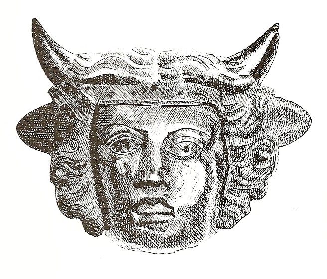 Au cours de mes lectures, je suis tombé sur la mention d’un dieu aux oreilles et aux cornes de taureau (et non de bélier ou de cerf). J’ai deux exemples : le dieu à cornes de taureau signalé par M. Green, dans The Gods of Roman Britain, Shire Archaeology, Aylesbury, 1983, p. 65-66, découvert en Grande-Bretagne et celui découvert chez les Arvernes dans le Puy-de-Dôme (CAG 63, 2, p. 154). Green en fait un dieu du panthéon celtique, mais sans donner de détails, dans la Carte Archéologique de la Gaule du Puy-de-Dôme, on parle juste d’un « dieu fluvial ( ?, je ne vois pas le rapport …) à cornes de taureau ». A noter qu’il n’a pas trois cornes comme pour Tarvos Trigaranus…
