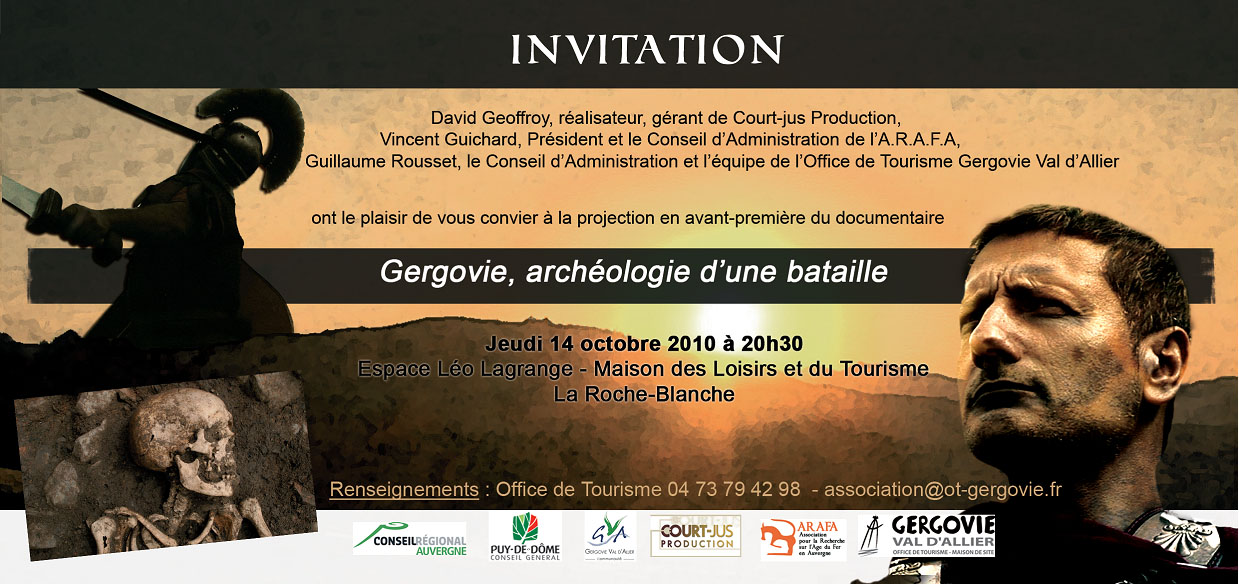 Le documentaire "Gergovie, archéologie d'une bataille" sera présenté en avant-première le jeudi 14 octobre 2010 à 20 h 30 Espace Léo Lagrange maison des Loisirs et du Tourisme La Roche Blanche 63. Affiche en pièce jointe sur laquelle ceux qui le connaissent reconnaîtront Stefanus de Pax Augusta qui comme les Gaulois d'Esse ont participé au tournage de ce film.